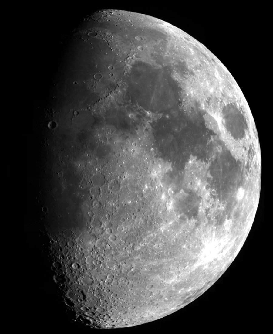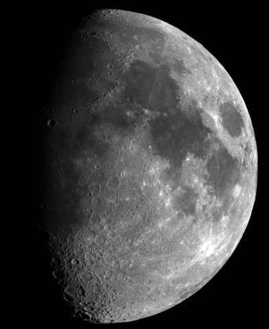 Waxing Gibbous Moon: This is my favorite image as many interesting things are visible. Craters, mountains, seas of lava and other details are just some of those that dot the surface. In the full resolution version (here, 147k) you can distinguish craters as small as 3 or 4 miles across. This is a mosaic of several dozen smaller images. |
