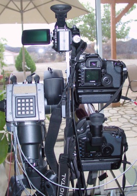 So the plan was to take a series of exposures three stops apart, plus some shots around second and third contact to see the prominences. To accomplish this I built a standalone controller box, which had been preprogrammed with a script of exposures for four of my seven cameras. The controller is the square silver box with a 4x4 keypad. Now, I have a rule for the minutes before total eclipses: if a piece of equipment doesn't work on the first try, give it a second try, if it fails again then CHUCK IT! So as it turned out, the extremely cold weather at the eclipse site caused the controller to malfunction (I believe batteries were the culprit), and I ended up doing the exposure sequence by hand. I wanted to focus on observing the eclipse rather than fuddling with cameras, so during totality I mindlessly moved the exposure control on my cameras back and forth while pushing the shutter buttons. Of four cameras, one died from batteries, one appeared to have died (it was actually taking very long exposures), and two mostly worked (even though my initial impression was that they hadn't). The result was a bunch of blurred or underexposed or overexposed photos with only a handful of usable images. Luckily the good ones were in the right ranges to do a composite. Below are the four images that went into the composite, presented exactly as they came out of the camera (except for resizing from 3072x2048 to 400x267).