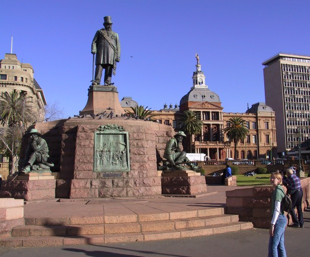 A statue of Kruger, with a palm-treed government building in the background.