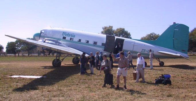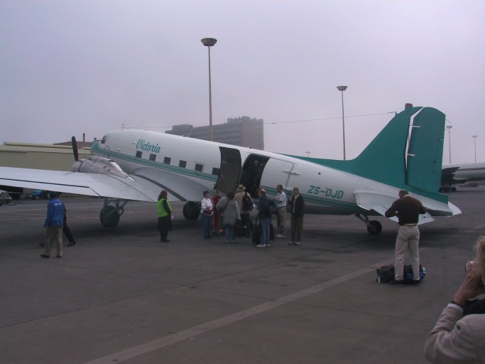 The next day we flew from Johannesburg to Zambia aboard a chartered DC3, built in 1941. The pilot is older than the plane, the toilet is incomprehensible, the emergency placards spell "Emergecy" wrong, the trim is broken so the ride is sickeningly rough, but gosh this is a great plane, really! I really came to love it, it has a lot of charm to it and it is built like a tank. I feel perfectly safe after the first hour.