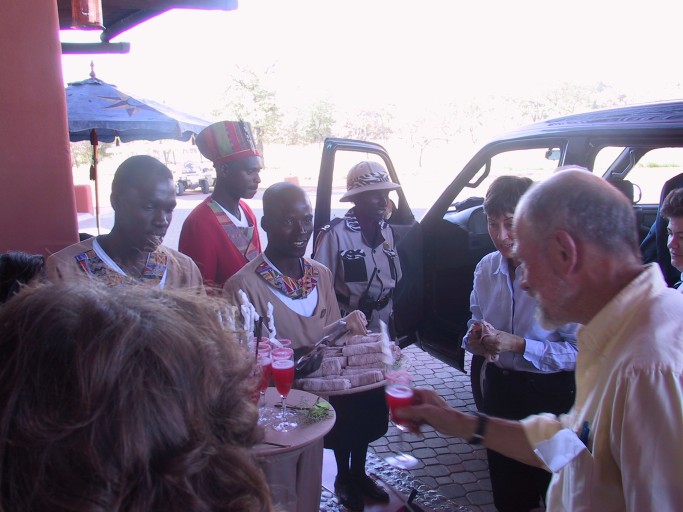 On the ground in Livingstone Zambia, next to Victoria Falls. We walked right through customs thanks to our group leader's excellent arrangements. Another group spent an hour and a half declaring every camera, every lens, every little thing they brought. We were greeted at the hotel with a cocktail (tropical punch, I think) and a washcloth.