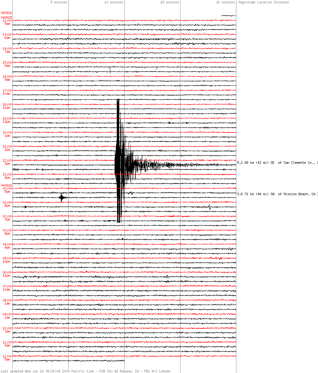 - June 15, 2004: Mag 5.2 earthquake off coast of San Diego. Felt so strong I took cover under the desk.