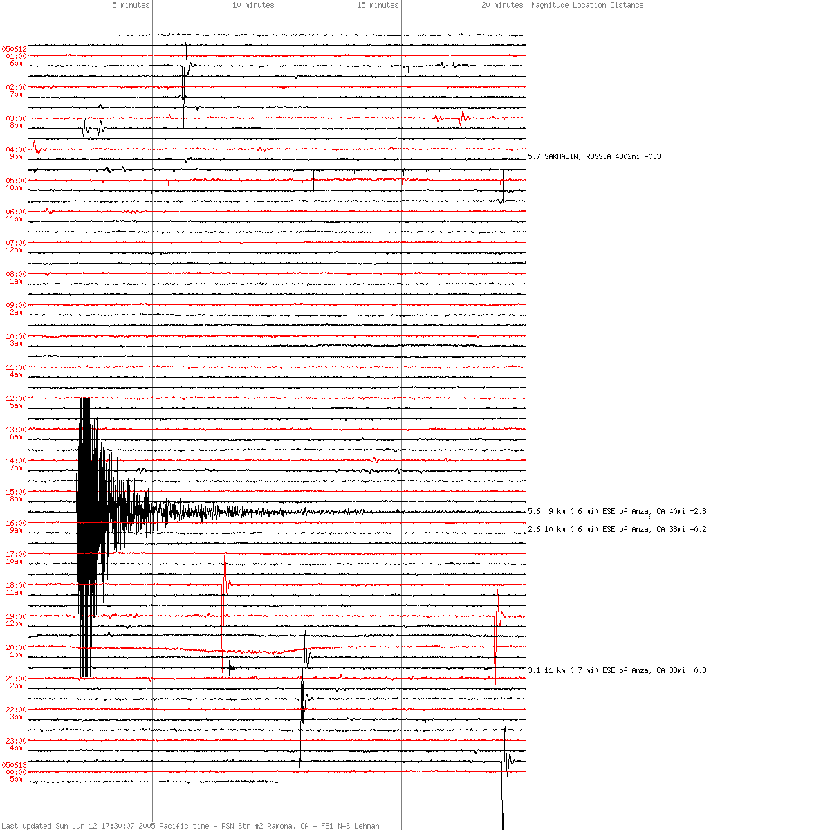 - Mag 5.6, June 12, 2005, Anza, CA. Felt a short sharp jolt that sent a shock through the building. (63 miles to epicenter).