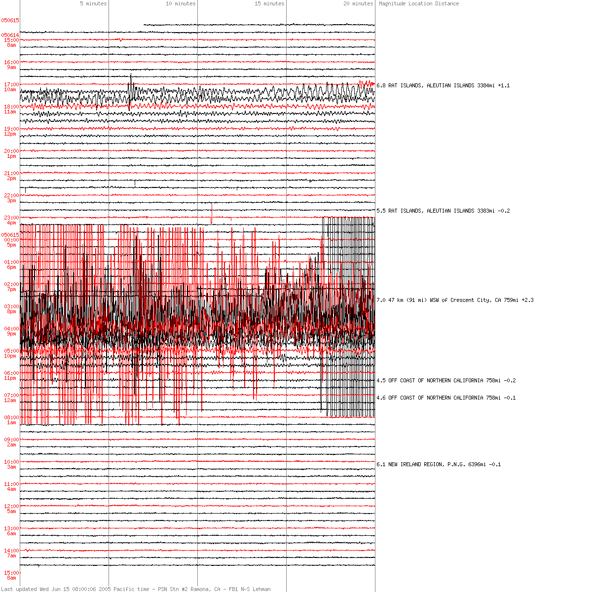 - June 14, 2005: This Mag 7.0 off Northern California triggered a genuine tsunami warning for the entire west coast of the USA. The entire town of Crescent City was evacuated, and even down here in San Diego the lifeguards advised people to leave the beaches! No tsunami was generated because of the earthquake's mechanism (a side to side movement that doesn't displace water).