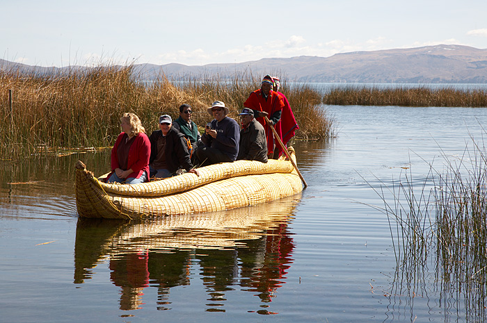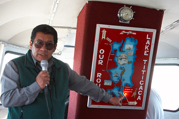 Our guide Ivan explains today's trip to Kala Uta and the Uros (floating islands, villages built on floating reeds) and Uruitu people.