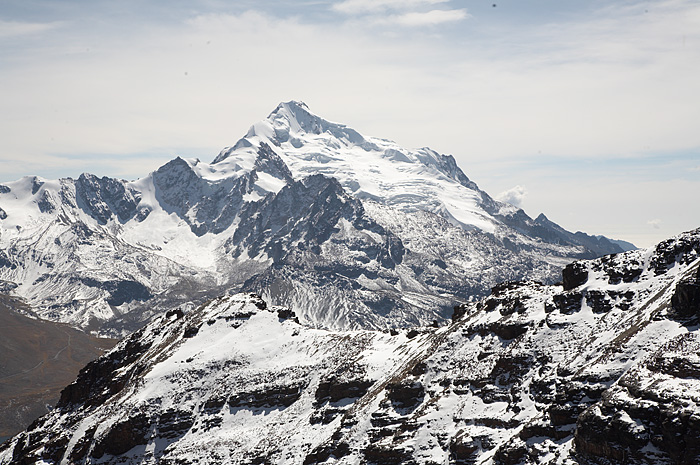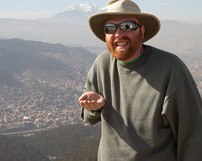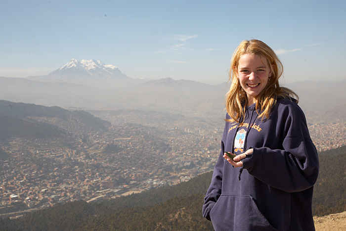 With La Paz in the background, Fred chews coca leaves to help prepare for the ascent up the mountain. Photo by Libby Winter.